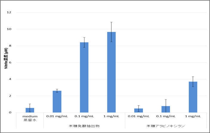 A製品は0.01mg/m1、0.1mg/mlでは蒸留水との差は見られず、1mg/mlのみNO産生の増加が認められた。しかしH製品は0.01mg/ml、0.1mg/mlのおいてもマクロファージを活性化した。また活性の度合いはA製品に活性化が認められた1mg/ml濃度でもH製品とは2~3倍の差があった。